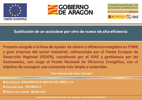INDUSTRIAS QUIMICAS DEL EBRO, S.A. has received financial aid for its energy saving and efficiency project “Replacement of an autoclave with a new high-efficiency autoclave”,co-financed by the European Regional Development Fund (ERDF), coordinated by IDAE and managed by the autonomous regions, funded by the National Energy Efficiency Fund, with the aim of achieving a cleaner and more sustainable economy. An energy saving and efficiency project has been developed, consisting in implementing a high efficiency autoclave, with an overall energy saving of 66.25 toe/year.